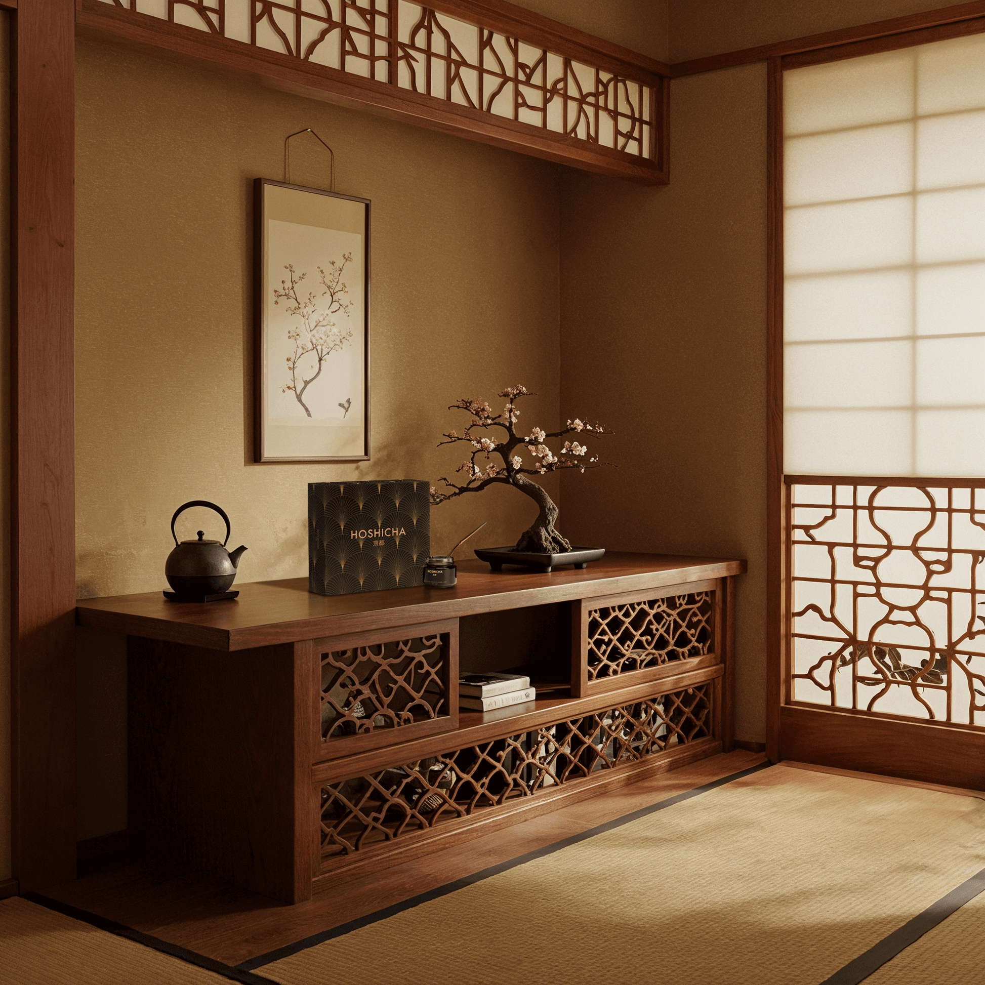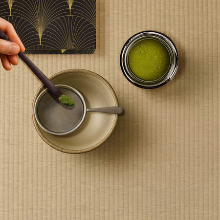 Using the tea scoop, scoop approximately 1 tsp of your Hoshicha matcha powder onto a sift before into the bowl. This breaks up clumps and creates a smoother consistency.